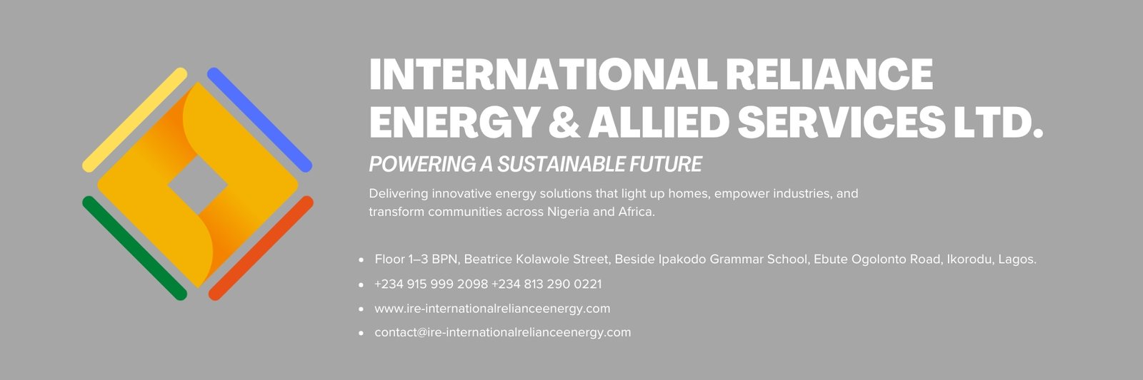 International Reliance Energy & Allied Services Limited (IRE) is a Nigerian-based engineering and energy solutions company committed to delivering excellence in electrical power generation, renewable energy, oil and gas services, and more. With over a decade of experience, we build resilient systems and long-term value for our clients.